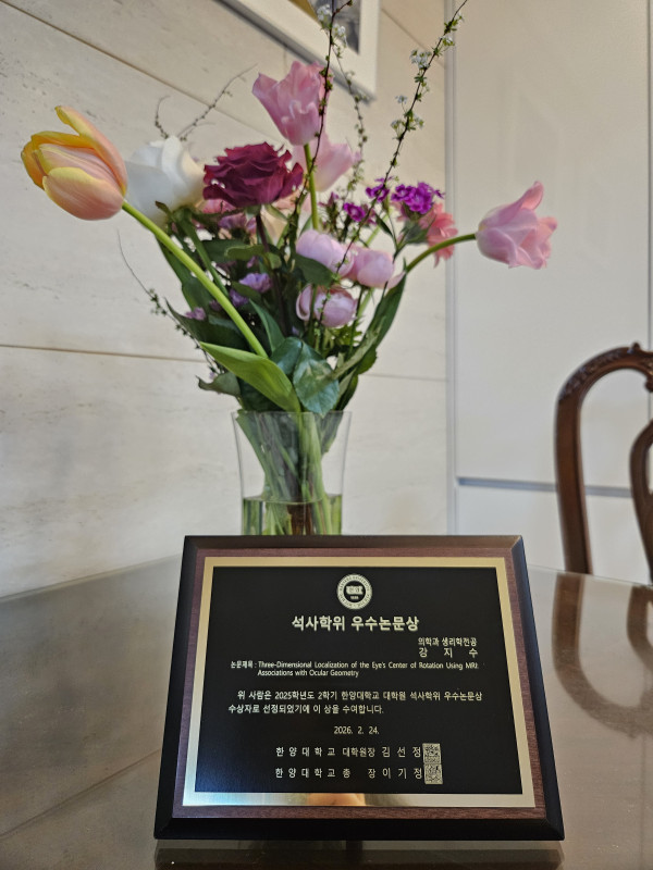 강지수 졸업생 석사학위 우수논문상 수상 페이지 정보 작성자 NiNE 댓글 0건 조회 42회 작성일 26-03-04 21:08 목록 본문 페이스북 공유 트위터 공유 생리학교실 석사과정 강지수 졸업생이 대학원 석사학위 우수논문상을 수상하였습니다. 다음글(마감) 2026년도 상반기 (1학기 신입) 대학원 모집 (의생명공학전문대학원 생체의공학과) 25.09.18 댓글 0 댓글목록 등록된 댓글이 없습니다.